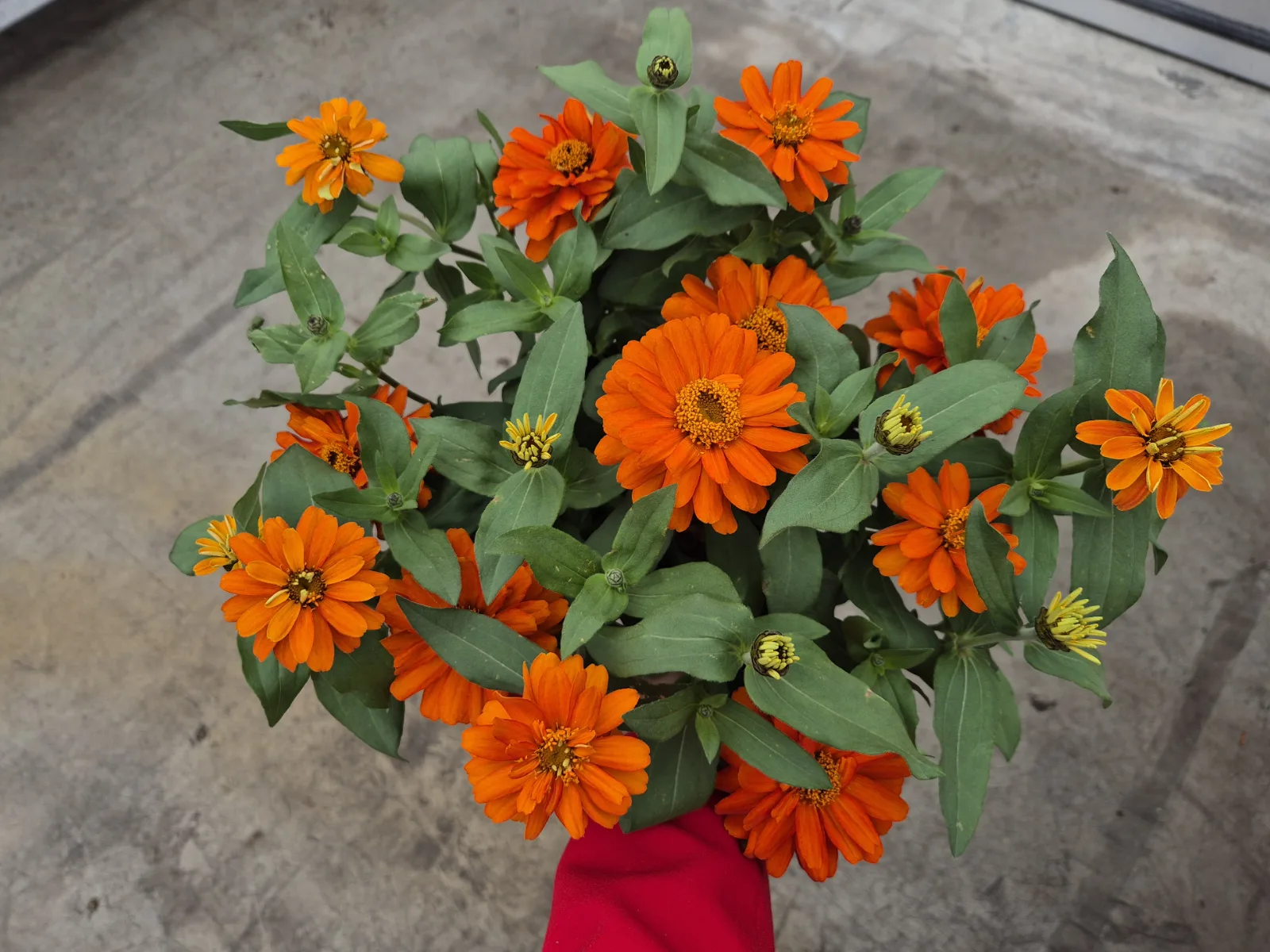 Pildītu ziedu cinnija ar labi sazarotu augumu un bagātīgu ziedēšanu.